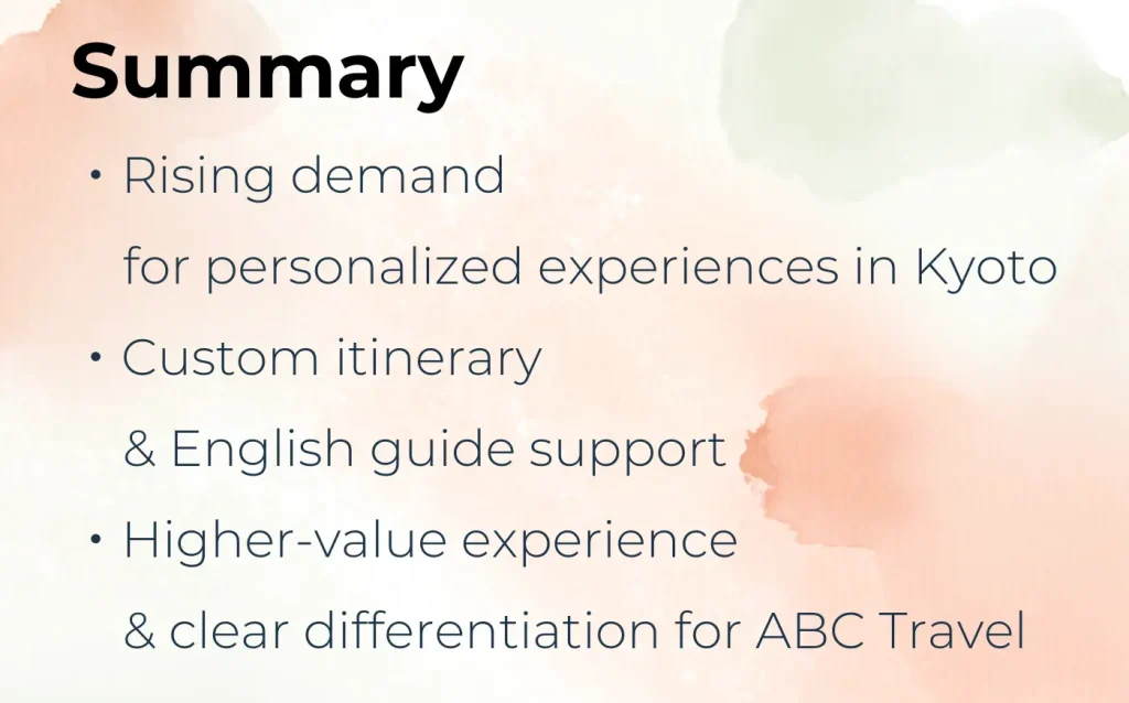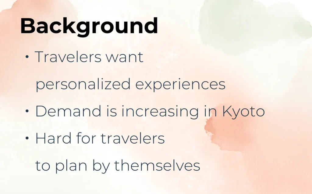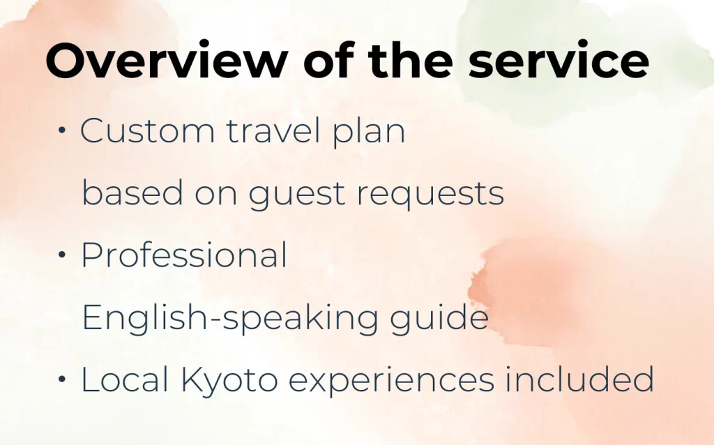 - There is a growing demand for personalized experiences in Kyoto.(京都では、個別にカスタマイズされた体験の需要が高まっています。)