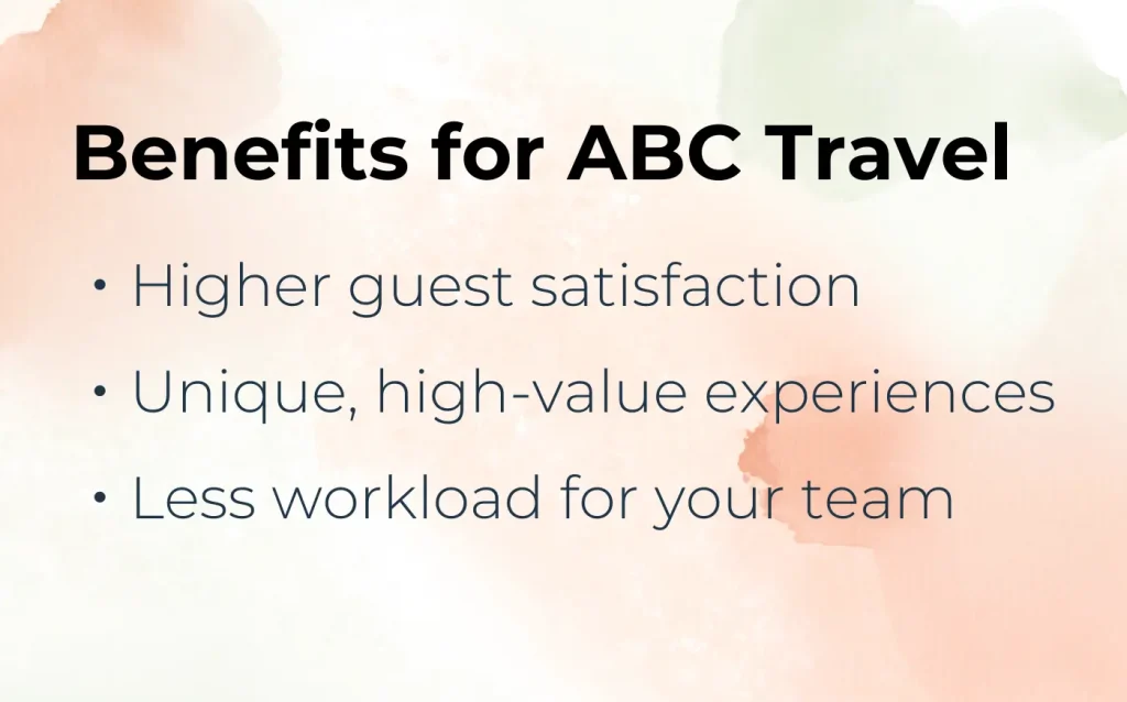 - These are the key benefits for ABC Travel.(ABCトラベル様にとっての主なメリットです。)
