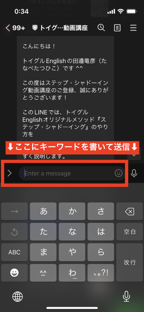 お客様のスマートフォンより「LINE」のアプリを開いてください。『Real English Program』(= 本動画講座の案内が届いているアカウント)より、秘密のキーワードを入力して、お送りください。